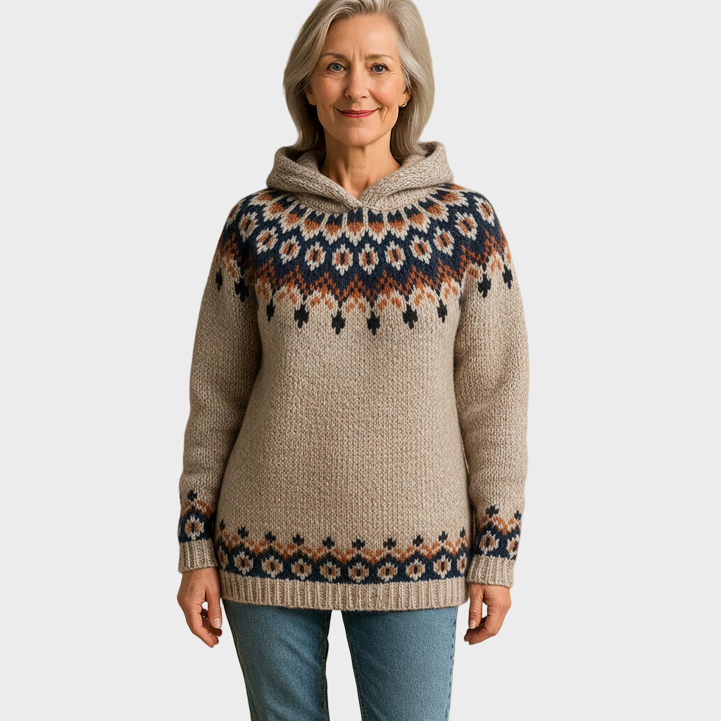 Ova pletenina ne grebe i ne iritira kožu zahvaljujući mekanoj, prozračnoj mješavini koja prija koži. Grije vas bez pregrijavanja, idealno za promjenjivo jesensko vrijeme. Materijal zadržava oblik – bez rastezanja ili opuštanja nakon nekoliko nošenja. Šareni, skandinavski nadahnuti uzorak dodaje razigran, a ipak moderan dodir svakom outfitu. Uparite ga s trapericama ili kratkim hlačama za ležeran look, ili ga podignite uz suknju i čizme. Kapuljača pruža dodatnu toplinu i opuštenu atmosferu.