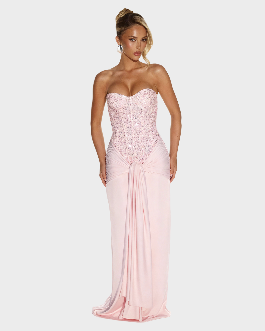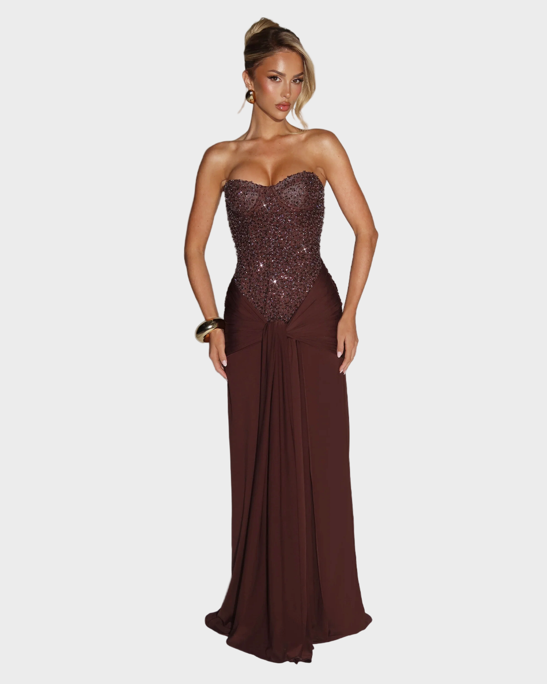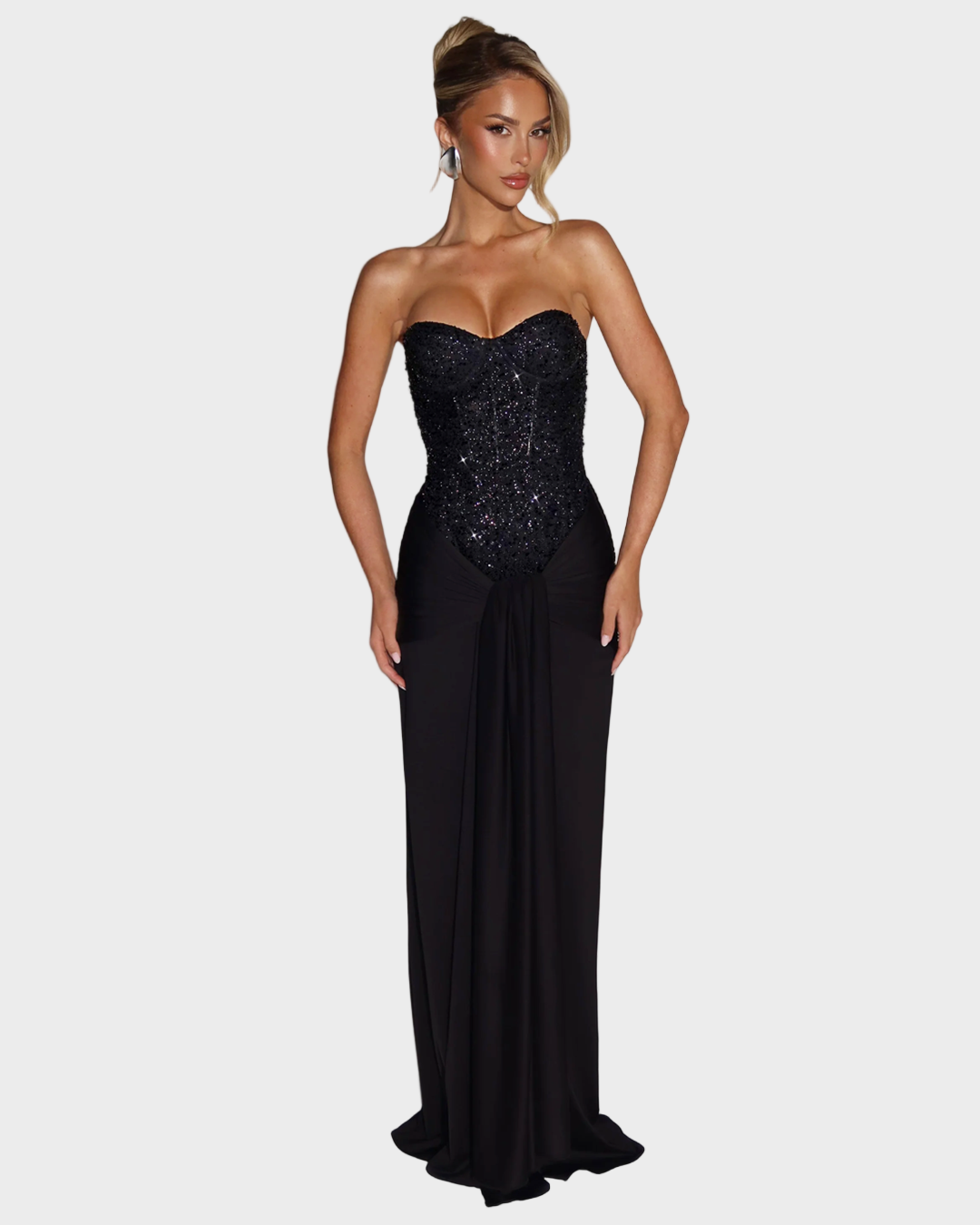 Zavodljiva. Sofisticirana. Nezaboravna. Selina Maxi haljina spaja senzualnu ženstvenost s luksuznom večernjom odjećom. Korzet s blistavim aplikacijama stvara zadivljujuću siluetu, dok lepršava suknja elegantno pada preko bokova, savršeno naglašavajući vašu figuru. Haljina koja dodaje glamur svakom pokretu - idealna za posebne prigode, elegantne događaje ili večeri kada želite biti u središtu pažnje.